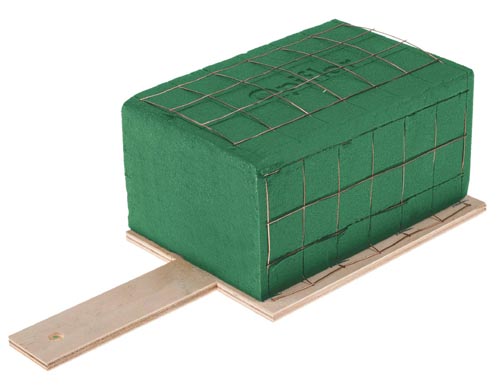 Najoblúbenejšia Aranžovacia hmota pre živé a suché kvety, vo veľkosti 3/4 tehla. S drôtovým obalom, na drevenom základe. Praktická drevená rúčka 11 cm, ľahko sa prenáša, predvrtané otvory pre ľahkú montáž.