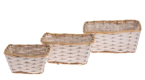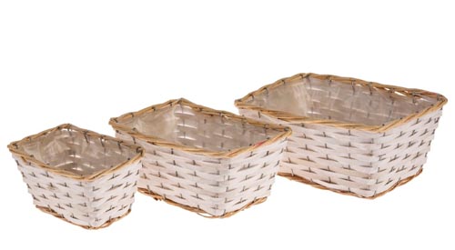 rozmery: 15 x 15 x 9 cm, 20 x 20 x 10 cm, 23 x 23 x 12 cm, košík zo štiepaných drevených pásikov, vystlaný fóliou