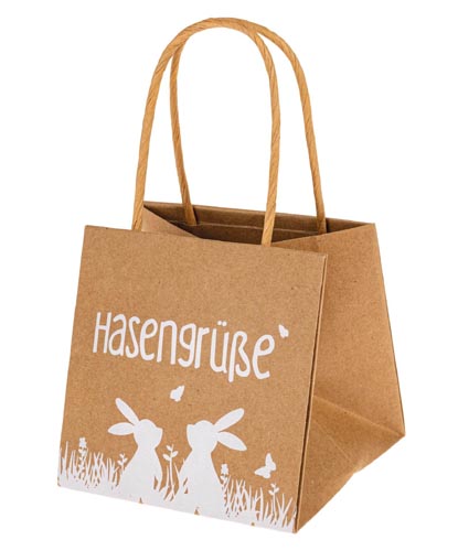 Papierová taška z kraftového papiera s rúčkami, motívom králika a potlačou Hasengrüße. Vnútorná strana vodotesná.