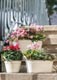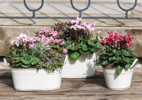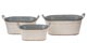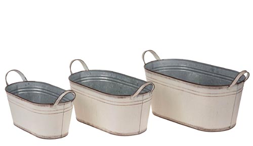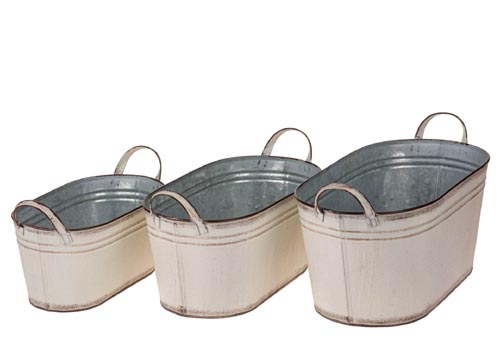 Rozmery: 26 x 14 x 11,5 cm, 31,5 x 17 x 13,5 cm, 36,5 x 18,5 x 15,5 cm. Oválny, plechový kvetináč s uškami, vo vzhľade vintage.