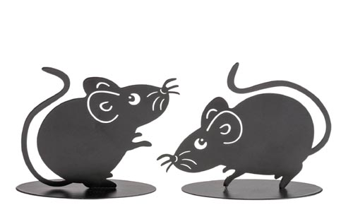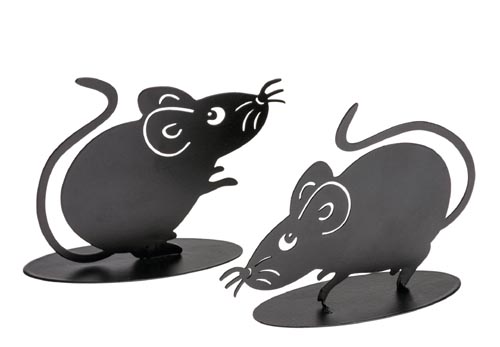 Kovová myš na podstavci. Rozmery: 8,5 x 3 x 7 cm a 9,5 x 3 x 8 cm.