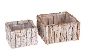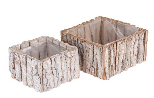 Rozmery: 14 x 14 x 9 cm, 18 x 18 x 10 cm. Štvorcový kvetináč vyrobený z bielenej kôry, vystlaný fóliou.